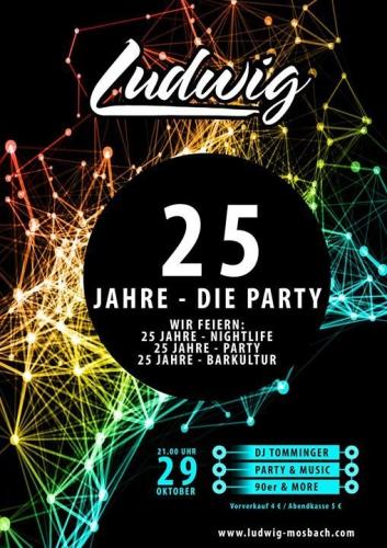 Die große 25 Jahre Ludwig Party. Wir feiern unter dem Motto: 90er & More ... 25 Jahre Ludwig - 25 Jahre Nightlife - 25 Jahre Party - 25 Jahre Barkultur ... An den Turntables: DJ Tomminger. Los geht es ab 21 Uhr. Vorverkauf 4,- € / Abendkasse 5,- €