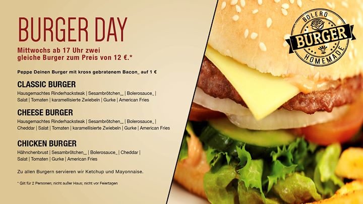 Mittwoch ab 17.00 Uhr zwei gleiche Burger* zum Preis von 12€ !!!