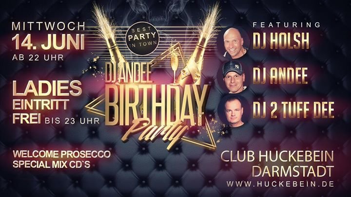 DJ AnDee aka Andreas Karmann feiert auch dieses Jahr wieder seinen Geburtstag im Huckebein Darmstadt. Als besonderes Highlight präsentieren wir Euch zusätzlich die beiden altbekannten Resident-Deejays 2 TUFF DEE & DJ HOLSH an den Turntables.