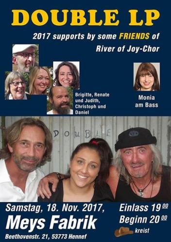 Am Samstag, dem 18. November, spielen „Double LP“ wieder gegen den November-Blues. Das Acoustic-PopRock-Trio hat bereits in den letzten Jahren mit unterschiedlichen Themen seine spezielle „Cover-Mucke" gegen den November-Blues in der Meys Fabrik vorgestellt. Während das Motto 2015 „Benefiz für und mit Bianca“ und 2016 „More than 50 Years Rock-Pop-Singer“ lautete, wird 2017 ein neuer Akzent gesetzt: „Double LP und Freunde des River of Joy-Chors". Mit Renate, Judith, Brigitte, Christoph und Daniel werden „Double LP“ einige Songperlen aus der zweiten und dritten Reihe des Rock-und Pop-Genres im veränderten Gewand interpretieren.