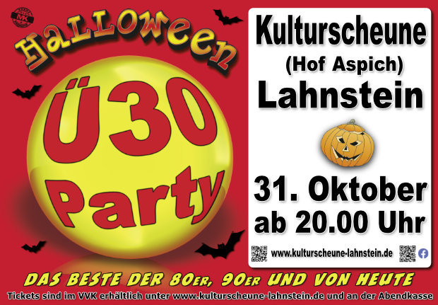 Pünktlich zu Halloween am 31.10. ab 20 Uhr steigt wieder die Ü-30 Party der Region und wo könnte man uriger diese Party feiern als direkt am Waldrand in der Kulturscheune auf dem Hof Aspich in Lahnstein. Hier feiern die ewig jung gebliebenen Ü-30er wieder bis in die frühen Morgenstunden zu den Hits der 80er, 90er und von heute. Nicht nur ultimativ, sondern auch legendär ist die Ü-30 Party von und mit „Kult-DJ Micha“, der es versteht das Publikum bis zur Ekstase auf der Tanzfläche abfeiern zu lassen. Von Fox bis Rock ist hier für jeden etwas dabei.