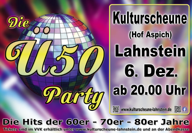 Am Samstag 6. Dezember ab 20 Uhr geht die Ü-50 Party in die neunte Runde, die Party-Reihe der Kulturscheune Lahnstein, diese für die Feier, Party und Tanzfreudigen Ü-50er gedacht ist.