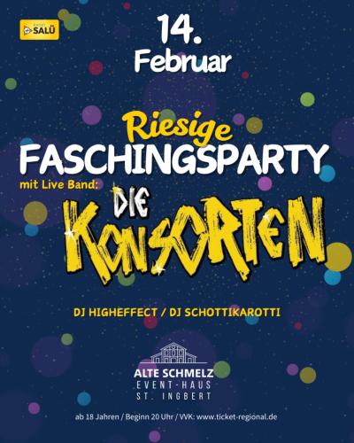 Unter dem Motto „Riesige Faschingsparty auf der Alten Schmelz“ erwartet die Besucher am Faschingssamstag ein buntes, abwechslungsreiches Partytreiben mit Live-Musik und DJs. Die bekannte Band „DIE KONSORTEN“ sorgt für beste Stimmung.