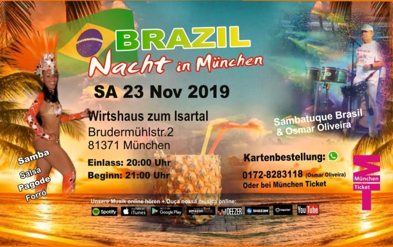 Sambatuque Brasil, seit drei Jahrzehnten eine der größten, ältesten und erfolgreichsten Samba-Gruppen außerhalb Brasiliens, kehrt mit besten Erinnerungen an den Ausgangsort ihrer außergewöhnlichen Karriere zurück: ins Wirtshaus zum Isartal. Dort wurde Anfang der 90er-Jahre die „1. Brasil Party“ in München organisiert. Am 23.11.2019 lädt Bandleader Osmar Oliveira alle Freunde südamerikanischer Rhythmen zu einer heißen Nacht mit Samba, Salsa, Sertanejo, Forró, Merengue, Shows und Caipirinha ein. Sie erwartet ein atemberaubendes Live Party – mit feinen brasilianischen Köstlichkeiten und tropischen Cocktails. Osmar Oliveira: „Wer vorher schon ein paar Kostproben von unserer Musik hören und sehen will, sollte einfach unseren YouTube-Kanal «Sambatuque Brasil Official» anklicken
