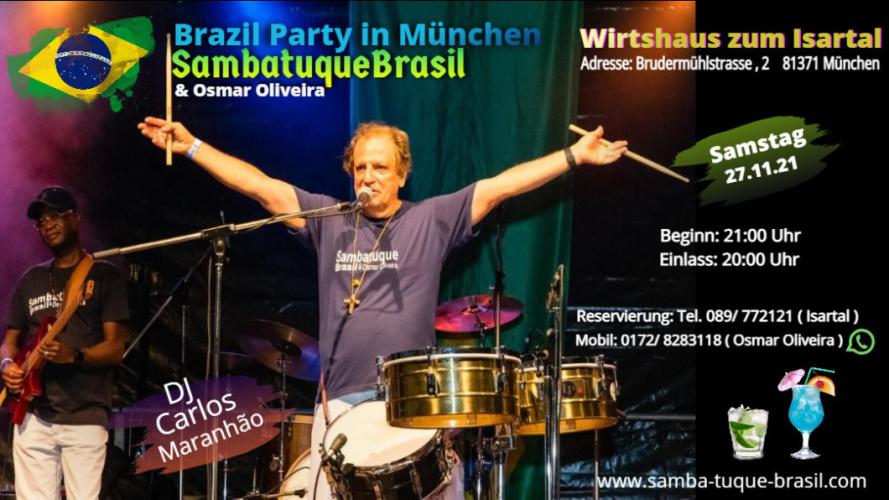 Sambatuque Brasil, seit drei Jahrzehnten eine der größten, ältesten und erfolgreichsten Samba-Gruppen außerhalb Brasiliens, kehrt mit besten Erinnerungen an den Ausgangsort ihrer außergewöhnlichen Karriere zurück: ins Wirtshaus zum Isartal. Dort wurde Anfang der 90er-Jahre die „1. Brasil Party“ in München organisiert. Am 27.11.2021 lädt Bandleader Osmar Oliveira alle Freunde südamerikanischer Rhythmen zu einer heißen Nacht mit Samba, Salsa, Sertanejo, Forró, Merengue, Shows und Caipirinha ein. Sie erwartet ein atemberaubendes Live Party – mit feinen brasilianischen Köstlichkeiten und tropischen Cocktails. Osmar Oliveira: „Wer vorher schon ein paar Kostproben von unserer Musik hören und sehen will, sollte einfach unseren YouTube-Kanal «Sambatuque Brasil Oficial» anklicken
