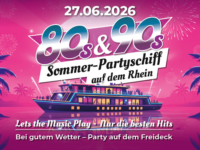 Steig ein zur ultimativen 80er/90er-Partynacht auf dem Rhein! Ab Andernach geht’s Richtung Koblenz vorbei an Festung Ehrenbreitstein und Deutschem Eck – mit DJ, Tanzfläche, Drinks & Sommerfeeling pur. Nach der Rückkehr wird in der Andernacher Altstadt weitergefeiert!