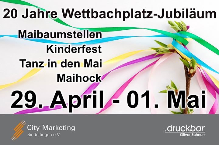 Sonntag, 30.04. ab 12 Uhr: Kinderfest mit Spielstraße rund um den Wettbachplatz. Ab 19.30 Tanz in den Mai mit Aufführungen der Tanzgruppe VFL Sindelfingen und der Band MusicSensation