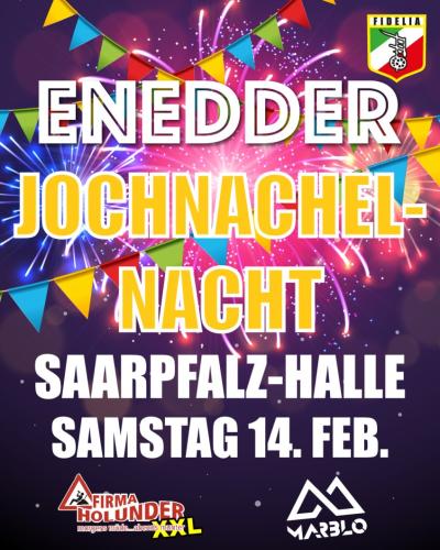 Feiert mit uns am 14. Februar 2026 die legendäre Enedder Jochnachelnacht in der Saarpfalz-Halle, Homburg-Einöd! Ab 20:11 Uhr entfacht die Bühne mit energiegeladener Live-Musik von "Firma Holunder XXL" und den mitreißenden Beats von "DJ MARBLO" Lasst uns gemeinsam in eine Welt voller Rhythmus und Tanz eintauchen – seid dabei, wenn die Nacht zum Tag wird!