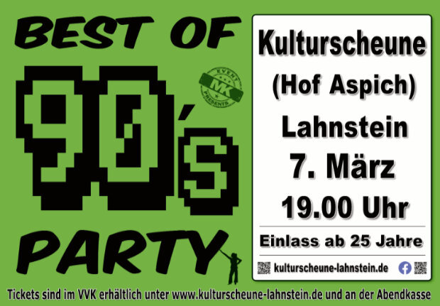 Am Samstag den 7. März ab 19:00 Uhr steigt eine weitere Ausgabe der 90er Party in der Kulturscheune auf dem Aspich.