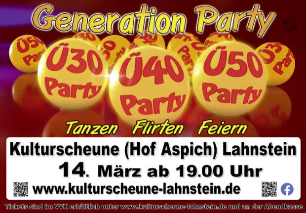 Am Samstag 14. März ab 19:00 Uhr steigt wieder die beliebte „Generation Party“ in der Kulturscheune auf dem Aspich in Lahnstein.