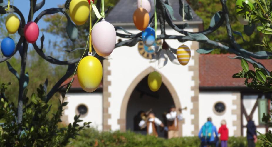 Farbenfrohe Schmetterlinge aus Holz in den Bäumen sowie ein Osterbrunnen verbreiten in Tripsdrill fröhliche Osterstimmung. Beim Ostereier-Suchspiel durch den ganzen Park haben Sie die Möglichkeit, tolle Preise zu gewinnen – hier ist Spaß garantiert!