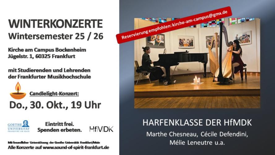 Do., 30.10., 19 Uhr, ist die Harfenklasse mit sechs (!) Harfenist*innen der Hochschule für Musik und Darstellende Kunst Frankfurt (HfMDK) zu Gast in der Kirche am Campus Bockenheim, Jügelstraße 1, 60325 Frankfurt. Bei stimmungsvollem Kerzenschein erklingen Werke für Harfe Solo aus verschiedenen Epochen und Stilrichtungen, die die klangliche Vielfalt dieses Instruments - von fein schwebenden Melodien bis zu modernen, farbenreichen Kompositionen – in unterschiedliche Weise zeigen.