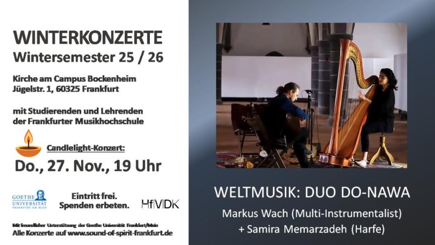 Beim 2. Candlelight-Konzert in der Reihe der Winterkonzerte 25/26 ist Do., 27.11., 19 Uhr, das Duo "do-nawā" (zwei Melodien) mit einem transkulturellen Konzert zu Gast in der Kirche am Campus Bockenheim, Jügelstraße 1, 60325 Frankfurt.