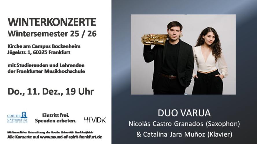 Donnerstag, 11.12., 19 Uhr, öffnet die Kirche am Campus Bockenheim, Jügelstr. 1, 60325 Frankfurt, ein letztes Mal in diesem Jahr ihre Türen zu einem besonderen Konzert vor der kleinen Weihnachtspause. Unter dem Titel „Zwischen Lateinamerika und Europa“ gestaltet das Duo Varua den Abend – ermöglicht durch das kurzfristige Einspringen für das u. a. krankheitsbedingt ausgefallene Konzert der Gesangsklasse der HfMDK.
