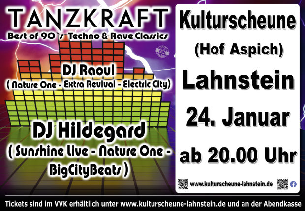 Am Samstag 24. Januar ab 20 Uhr steigt die weit über die Region hinaus beliebte 90er Techno & Rave Classics Party in der Kulturscheune Lahnstein auf dem Aspich.