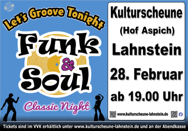 Am Samstag 28. Februar ab 19:00 Uhr steigt die nächste Funk & Soul Disco Classics Night in der Kulturscheune Lahnstein – Let`s Groove Tonight zu den besten Funk & Soul Disco Classics.